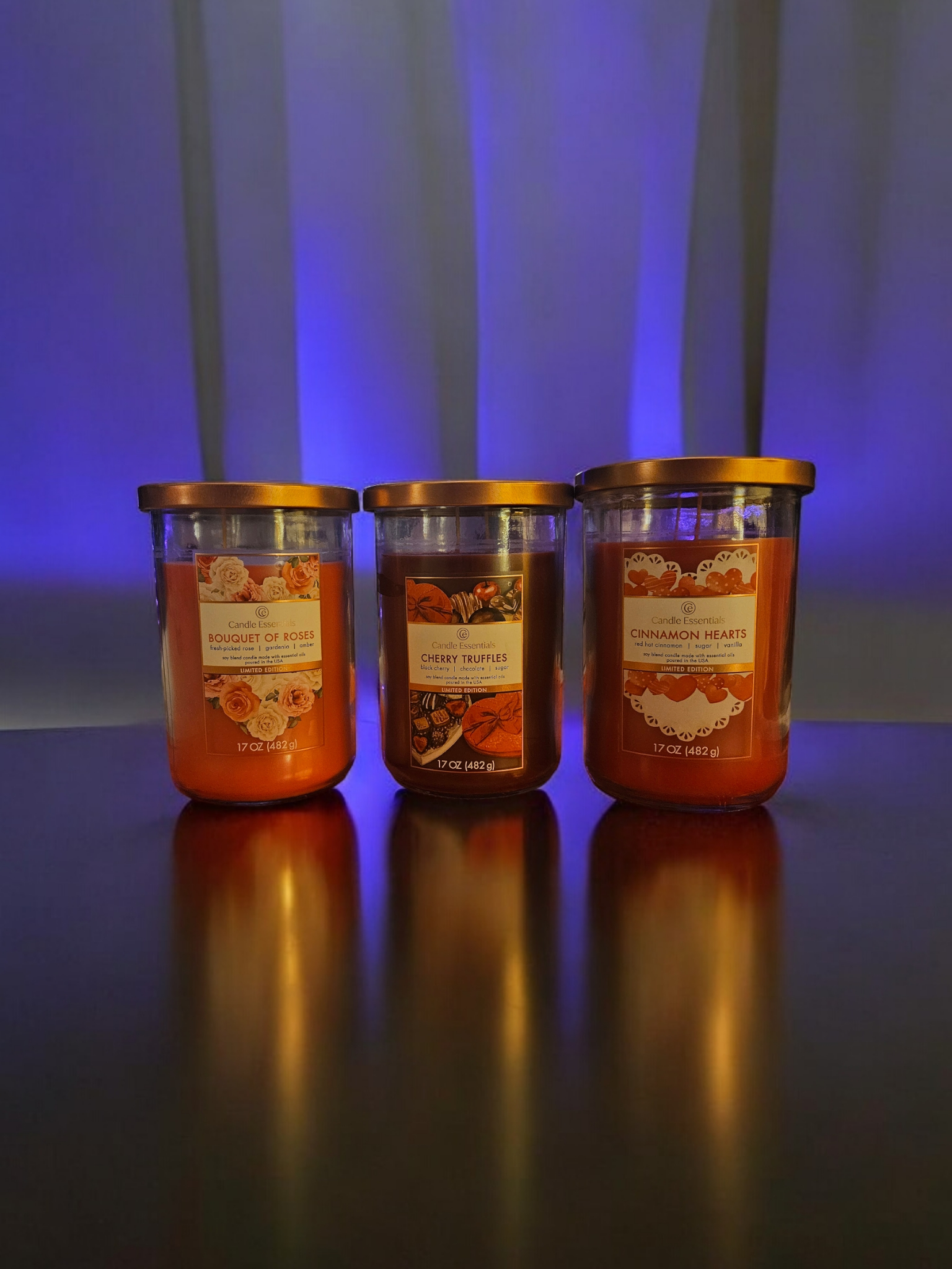 Cinnamon hearts & Bouquet of Roses scented 2 wick Candles(17oz) With rose petal romance 6 pack scented wax melts. 2.5 oz. Soy blend.
